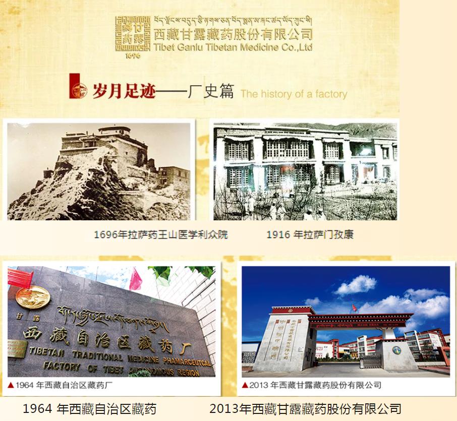 西藏甘露藏药股份有限公司是一家具有悠久历史的传统藏药生产企业,其前身是拉萨药王山利众医学院,始建于公元1696年。西藏和平解放后,在党和政府的关怀下,于1961年乔迁新址扩建为“西藏自治区藏医院制剂室”。2002年6月更名为“西藏自治区藏药厂”。2012年12月,将西藏自治区藏药厂改制为“西藏甘露藏药股份有限公司”(国有)。公司注册资金2亿元人民币,占地66667平方米,总资产近5亿元人民币。